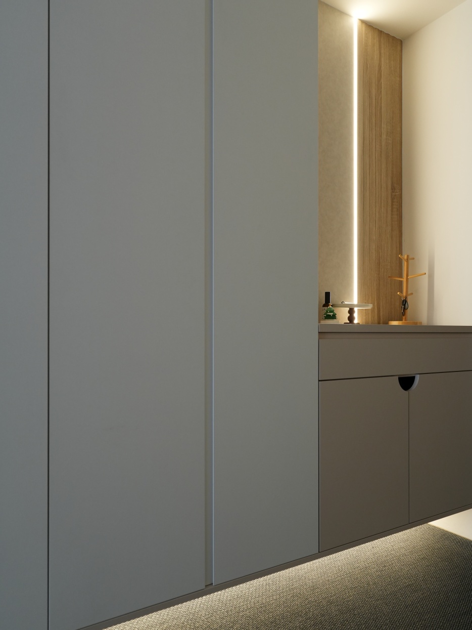 玄關矮櫃可以隨手放鑰匙等出門用品,底下懸空+間接照明可以輕鬆擺放拖鞋和外出鞋!