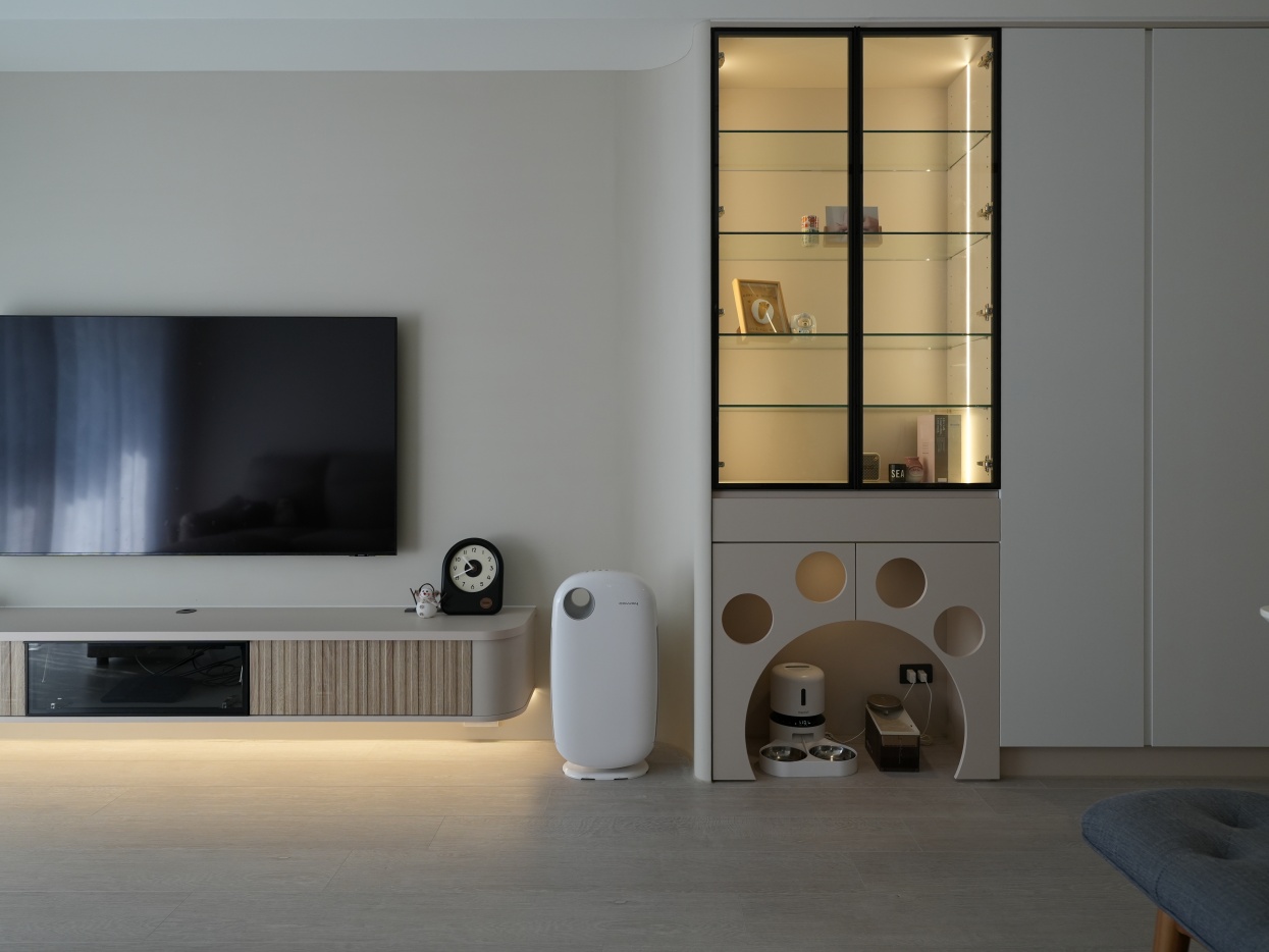寵物櫃上方做了展示櫃,讓整個客廳不要全都是收納櫃,留點空間保持通透感,裡面也擺放一些收藏品和裝飾品❤️