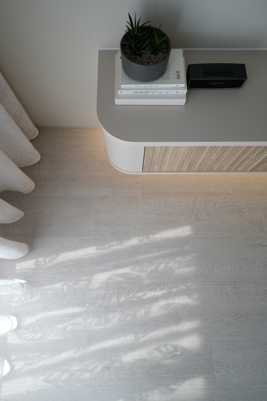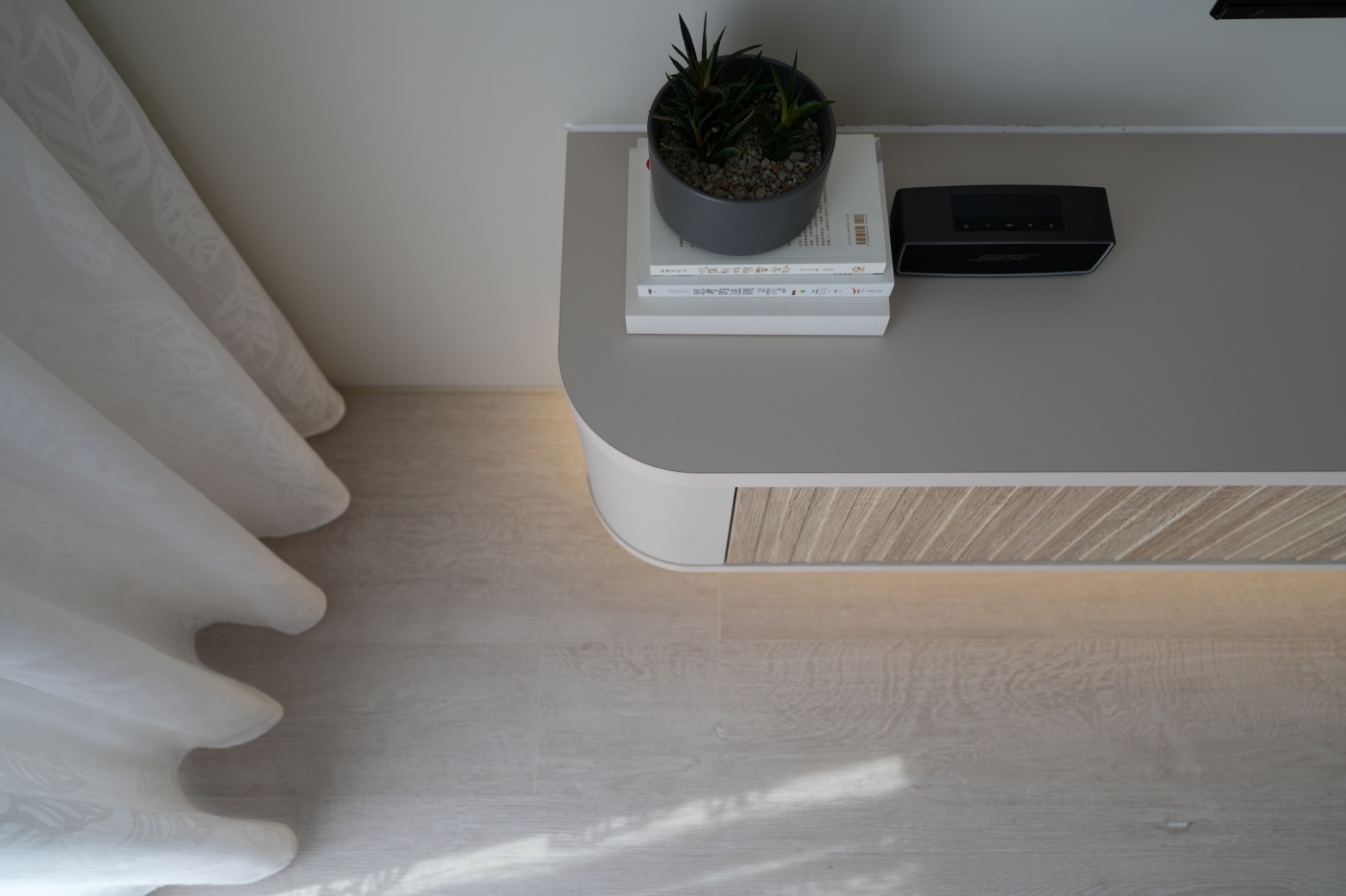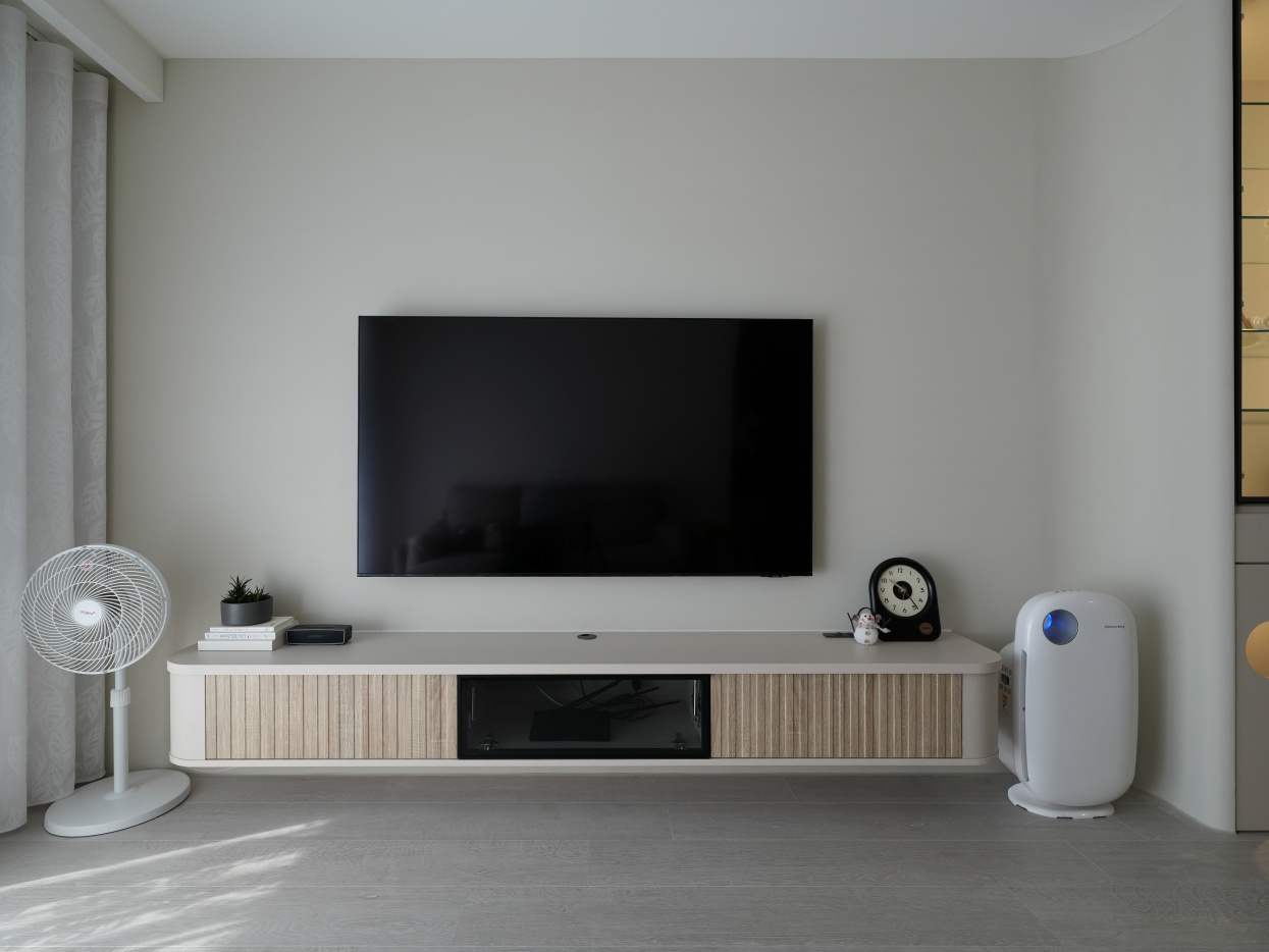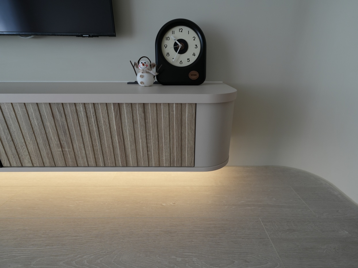 電視櫃圓弧設計,正在學走的嫩寶也不怕撞傷,懸空部份不僅視覺輕盈,洗地機或掃地機器人也可以輕鬆打掃喔!
